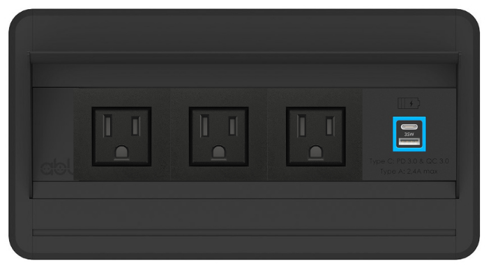 Flip-S 3xUSA socket 1xUSB A+C PD35W charger, Black fascias & end caps, Black body, 6.5ft integrated cable with USA plug