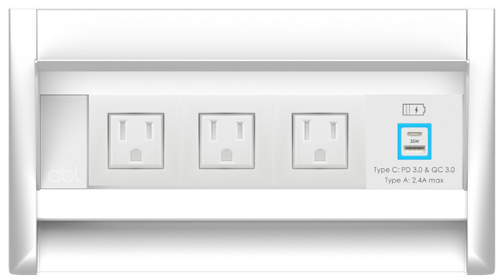 Flip-S 3xUSA socket 1xUSB A+C PD35W charger, White fascias & end caps, White body, 6.5ft integrated cable with USA plug