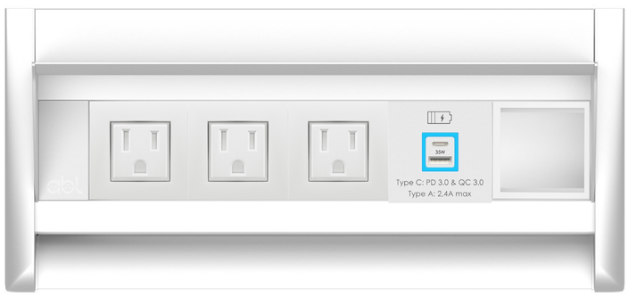 Flip-S 3xUSA socket 1xUSB A+C PD35W charger 1xIMP slot, White fascias & end caps, White body, 6.5ft integrated cable with USA plug