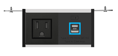 Fusion 1xUSA socket 1xUSB A+C PD65W charger , Black fascias & end caps, Silver body, 6.5ft integrated cable with USA plug